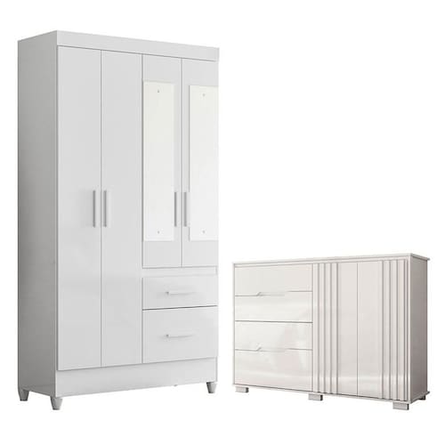 Guarda Roupa Solteiro Madri Flex com espelho e Cômoda Texas Branco Brilho – Moval