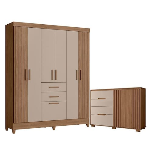Organize seu quarto com elegância e o melhor custo benefício do mercado. Apresentamos o Guarda Roupa Solteiro Malta e Cômoda Texas fabricados pela Moval. Guarda Roupa possui 07 portas sendo as laterais com detalhes frisados, 02 gavetas com corrediças metálicas, puxadores em MDF, cabideiro e calceiros em alumínio para melhor organização interna e pés em PVC. A cômoda possui 04 gavetas, com corrediças telescópicas, 02 portas com detalhes ripados, dobradiças 35mm com amortecedor, puxadores usinados e pés em PVC. Fabricado com materiais de alta qualidade que garante resistência e durabilidade ao produto. Confira mais detalhes e aproveite!