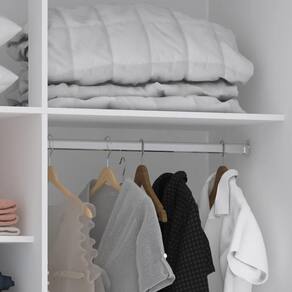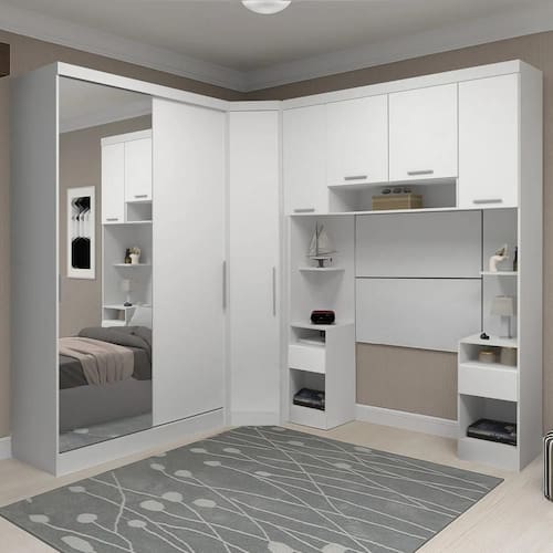 O Guarda Roupa de Canto conta com porta, puxador em polímero e prateleiras internas, aproveitando o canto do ambiente sem deixar espaços ociosos.