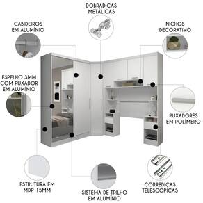 Características do Produto Material da Estrutura: MDP 15mm. Peso Suportado Distribuído: Guarda Roupa 30Kg/Canto Oblíquo 25Kg/Mesa Cabeceira 15Kg cada/Armário Aéreo 15Kg. Acabamento: Finish Foil (FF). Escala de Brilho: Fosco. Possui Prateleira: Sim. Quantidade de Prateleiras: 12 Prateleiras. Possui Maleiro: Sim. Possui Nicho: Sim. Quantidade de Nichos: 5 Nichos. Possui Porta: Sim. Quantidade de Portas: 7 Portas. Tipo de Porta: Convencional/Deslizante. Material das Dobradiças: Metal. Possui Espelho: Sim. Possui Gaveta: Sim. Quantidade de Gavetas: 5 Gavetas. Tipo das Corrediças: Telescópicas. Possui Puxador: Sim. Material dos Puxadores: Polímero/Alumínio. Possui Cabideiro: Sim. Quantidade de Cabideiros: 2 Cabideiros. Possui Pés: Não. Diferenciais: - Design moderno. - Amplo espaço interno. - Cabideiro em alumínio. - Corrediças telescópicas. - Módulos com rodapé. - Porta com espelho. Sistema de Montagem: Cavilhas/Parafusos/Minifix. Manual de Montagem: Sim. Complexidade da Montagem: Alta. Volumes: 15 Volumes. Conteúdo da Embalagem: 1 Guarda Roupa, 1 Canto Oblíquo, 2 Mesas Cabeceira Alta, 1 Armário Aéreo, 2 Painéis Cabeceira. Garantia do Fabricante: 90 dias contra defeito de fabricação. Montagem: Recomendamos que seja feita por um profissional. Recomendação de Limpeza: Utilize pano úmido.