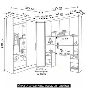 Outras Medidas (L x A x P) Guarda Roupa: 135 x 230 x 56 cm. Canto Oblíquo: 70 x 230 x 70 cm. Mesa de Cabeceira: 38 x 230 x 42 cm. Armário Aéreo: 97 x 82 x 42 cm. Painel Cabeceira: 97 x 90 x 1,5 cm.