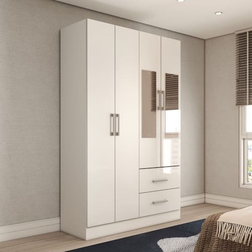 O(a) Guarda-Roupa Solteiro Paraná 4 Portas 2 Gavetas com Espelho Branco - Loja é produzido em MDP na escala de brilho Brilho e Semi-Brilho, e possui um grau de dificuldade de montagem: Médio.