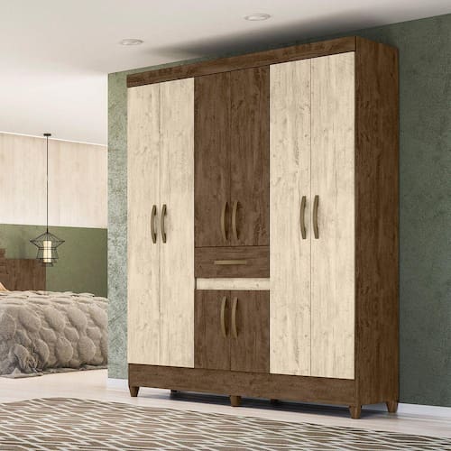 Características Estrutura em MDP de 12mm. Pintura em acabamento UV. 08 Portas articuladas com dobradiças metálicas. 01 Gaveta central com corrediças metálicas. Cabideiros em alumínio. Amplo espaço interno com prateleiras. Puxadores na cor bronze. Pés em PVC.