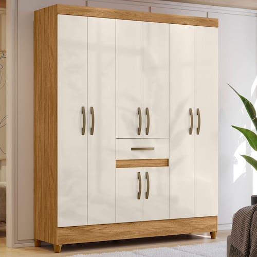 Características Estrutura em MDP de 12mm. Pintura em acabamento UV. 08 Portas articuladas com dobradiças metálicas. 01 Gaveta central com corrediças metálicas. Cabideiros em alumínio. Amplo espaço interno com prateleiras. Puxadores na cor bronze. Pés em PVC.