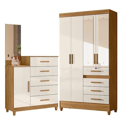 Está querendo renovar seu quarto com o melhor custo benefício do mercado. Apresentamos o Guarda Roupa Solteiro Sobral e Cômoda Lisboa fabricados pela Moval. Guarda Roupa possui 04 portas sendo 02 com espelhos, 04 gavetas sendo a primeira com fechadura e chave ideal para guardar itens pessoais com segurança, corrediças metálicas, puxadores em MDF, cabideiros em alumínio para melhor organização interna e pés em PVC. A cômoda possui 05 gavetas com corrediças metálicas, painel com espelho, puxadores em MDF e pés em PVC. Fabricado com materiais de alta qualidade que garante resistência e durabilidade ao produto. Confira mais detalhes e aproveite!