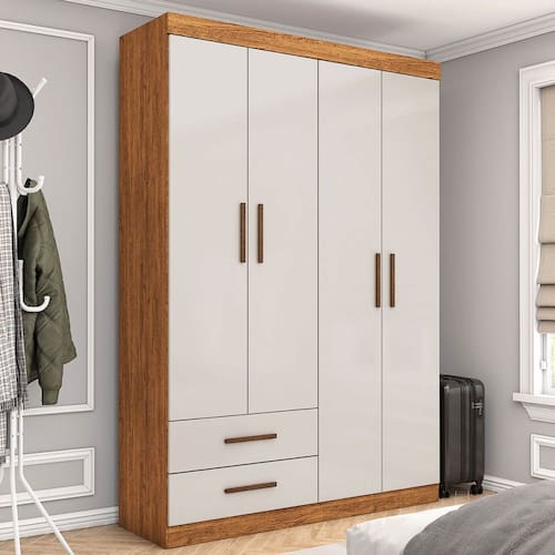 O(a) Guarda-Roupa Solteiro Genova 4 Portas 2 Gavetas Cinamomo/Branco - Carioca Móveis é produzido em MDP na escala de brilho Fosco e Semi-Brilho, e possui um grau de dificuldade de montagem: Médio.