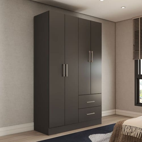 O(a) Guarda-Roupa Solteiro Vittorio 4 Portas 2 Gavetas Preto - Loja é produzido em MDP na escala de brilho Brilho e Semi-Brilho, e possui um grau de dificuldade de montagem: Médio.