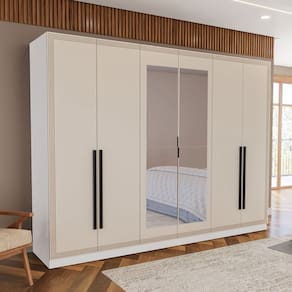 O(a) Guarda-Roupa Valência 6 Portas 4 Gavetas com Espelho Branco/Creme - Politorno é produzido em MDF e MDP na escala de brilho Semi-Fosco, e possui um grau de dificuldade de montagem: Médio.