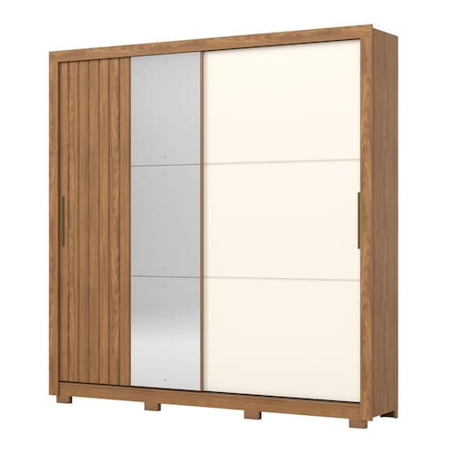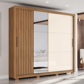 O Roupeiro Vasti combina elegância e praticidade em um único móvel. Possui 02 portas deslizantes com trilho em alumínio, porta com ripados soft, 04 gavetas com corrediças telescópicas e com usinagem para pega, porta com 03 espelhos, cabideiro e calceiro em alumínio, e puxadores em ABS com acabamento bronze. As ripas laterais, frentes e tampos das gavetas na cor da caixa, além de pés em ABS inclusos. Seu amplo espaço interno proporciona uma organização eficiente e funcional para o seu quarto. Cor: Nature/Off White Altura (cm): 230 Largura (cm): 229 Profundidade (cm): 51,5 Cor Interna: Trama Branco (Branco Acinzentado) Escala de Brilho: Fosco Ambiente: Quarto Acabamento: Pintura UV Texturizada Possui Vidros: Não Material Principal: MDP Produto Suporta até (Kg): 90 Kg Possui Espelho: Sim Possui Gavetas: Sim - Quantidade: 4 Und. - Peso Maximo Suportado por Gaveta: 3 Kg Possui Pés: Sim Quantidade de Pés: 8 Und. - Material dos Pés: ABS Possui Portas: Sim - Quantidade: 2 Und. - Tipo: Correr Possui Prateleiras: Sim - Peso Maximo por Prateleira: 8 Kg - Quantidade: 5 Und. Recomendações de Uso, Manutenção e Limpeza: Para limpeza de seu móvel, use uma flanela limpa e seca. Não utilize produtos químicos que possam danificar o produto. Sistema de Montagem: Parafusos e Cavilhas Necessita Montagem: Sim Complexidade da Montagem: Alta: Deve ser montado por um montador especializado. Itens Inclusos: 1 Guarda Roupa e Instrução de Montagem Garantia: 90 Dias