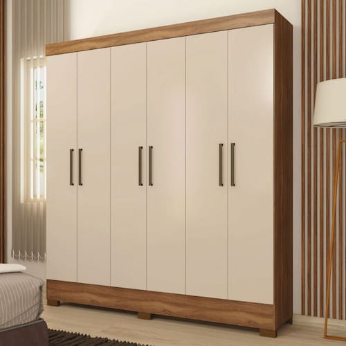 O(a) Guarda-Roupa Vero 6 Portas Amêndola/Off-White - Demóbile é produzido em MDF na escala de brilho Brilho e Fosca com Textura, e possui um grau de dificuldade de montagem: Difícil.