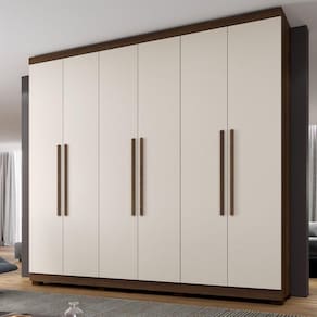 Guarda Roupa Viena 6 Portas 4 Gavetas 10 Prateleiras Imbuia Off O Guarda-Roupa Viena 6 portas e produzido em chapa de 15 mm que garante a vida util muito maior. Contem 6 portas e 10 prateleiras e nichos que acomodam suas roupas com maior conforto. Contem 4 gavetas espacosas com corredicas telescopicas que garante suavidade e durabilidade. cabideiro em aluminio, puxadores madeirados e pes inclusos. Sua fabricacao utiliza a linha mdp perffect, que une a sustentabilidade a inovacao tecnologica, proporcionando durabilidade e facil limpeza; inspirando sofisticacao ao mobiliario. Sua pintura UV conta com boa resistencia, e facil de limpar e e ecologicamente correto, pois utiliza madeira de reflorestamento, evitando o desmatamento. Caracteristicas: Material principal: MDP Espessura da chapa: 15 mm Escala de brilho: semibrilho Acabamento: Pintura UV Sistema de montagem: parafuso, cavilha e cantoneiras metalicas Quantidade de Portas: 06 Quantidade de Gavetas: 04 Quantidade de Prateleiras: 10