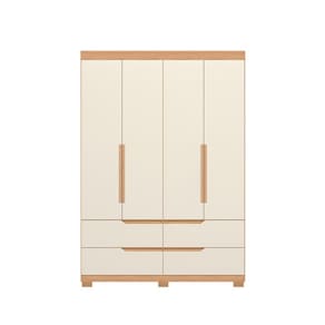 Feito em MDP.Possui detalhes nas portas laterais com acabamento ripado, 4 gavetas com corrediça telescópicas, 4 portas, 2 cabideiros e 10 prateleiras