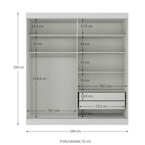 Não realizamos montagem, desmontagem, por escadas ou içamento. É responsabilidade do cliente verificar se as dimensões do produto são compatíveis com portas, elevadores e corredores. Evite imprevistos: confira todos os detalhes antes de concluir sua compra. MEDIDAS:: [ A ] = 200 cm [ L ] = 164 cm [ P ] = 51 cm | PESO:: 93,70 kg | PESO SUPORTADO:: 112 kg | GAVETAS SUPORTAM ATÉ:: 3 kg | PRATELEIRAS SUPORTAM ATÉ:: 6 kg | CABIDEIROS SUPORTAM ATÉ:: 12 kg | MODELO:: Guarda Roupas Casal 2 Portas de Correr 2 Gavetas Ruby | MARCA:: Maxel | ACABAMENTO:: Texturizado | TIPO DE PINTURA:: Verniz alto brilho | MATERIAL:: MDP | ESPESSURA DO MATERIAL:: 12 mm | PORTAS:: 2 | TIPO DE PORTA:: Correr | CORREDIÇAS:: Telescópicas | GAVETAS:: 2 | PRATELEIRAS:: 5 | MATERIAL DOS PUXADORES:: Plástico | CABIDEIROS:: 1 | MATERIAL DOS CABIDEIROS:: Alumínio | MATERIAL DA DOBRADIÇA:: Metal | PÉS:: Não possui | INSTRUÇÕES E CUIDADOS:: Utilizar panos secos, não utilizar produtos abrasivos ou químicos, manter longe do com água | DIFERENCIAL:: Perfis coloridos na montagem da porta, gavetas com corrediças telescópicas. | ITENS INCLUSOS:: 1 Guarda roupas, 1 manual de instruções e 1 kit parafuso | GARANTIA:: 3 Meses | AVISO:: Importante sobre a : A é realizada até a portaria ou porta de entrada do indicado, desde que o acesso seja permitido. Para locais com portaria, a será feita no piso térreo. | Altura: 200 | Inclui manual de montagem: sim | Largura: 164 | Materiais da estrutura: mdp | Profundidade: 51 | Requer montagem: sim | Cor: Branco
