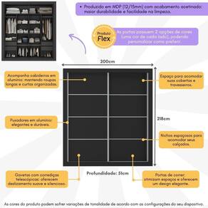 Produzido em MDP (12/15mm) com acabamento acetinado (cerca de 20% de brilho), este guarda-roupas garante resistência e um toque moderno ao ambiente. As 2 portas de correr possuem 2 opções de cores (cada lado de uma cor), permitindo personalizar o móvel entre 3 combinações no momento da montagem, adaptando-o à decoração do seu quarto.