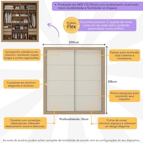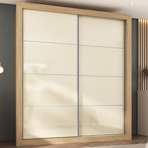 Design e durabilidade: Produzido em MDP (12/15mm) com acabamento acetinado (cerca de 20% de brilho), este guarda-roupas garante resistência e um toque moderno ao ambiente. As 2 portas de correr possuem 2 opções de cores (cada lado de uma cor), permitindo personalizar o móvel entre 3 combinações no momento da montagem, adaptando-o à decoração do seu quarto.