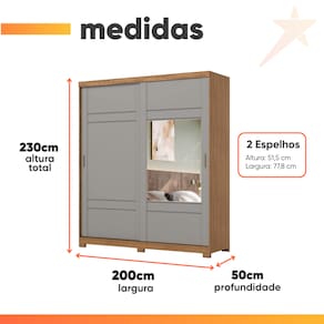 MEDIDAS: A = 230 cm L = 200 cm P = 50 cm MEDIDAS DO ESPELHO (cada lâmina): A = 51,5 cm L = 77,8 cm MEDIDAS DOS PÉS: A = 6 cm L = 10 cm P = 4 cm PRATELEIRAS SUPORTAM ATÉ: 8 kg GAVETAS SUPORTAM ATÉ: 3 kg CABIDEIROS SUPORTAM ATÉ: 8 kg PESO: 128 kg MODELO: Guarda Roupas Casal 2 Portas de Correr com Espelho 3 Gavetas Dalia MARCA: Henn MATERIAL: MDP TIPO DE PORTA: Correr, maior praticidade no dia a dia QUANTIDADE DE PORTAS: 2 DOBRADIÇAS: Metálicas GAVETAS: 3 CORREDIÇAS: Metálicas PRATELEIRAS: 5 CABIDEIROS: 2 MATERIAL DO CABIDEIRO: Alumínio ESPELHO: Sim, 2 lâminas PUXADORES: 2 unidades, em Alumínio PÉS: 6 unidades DIFERENCIAL: Portas de correr com espelho ITENS INCLUSOS: 1 Guarda Roupa, 1 Manual de montagem, 1 Kit Parafusos. SISTEMA DE MONTAGEM: Parafusos e Cavilhas INSTRUÇÕES E CUIDADOS: Para limpeza de seu móvel, use uma flanela limpa e seca. Não utilize produtos químicos que possam danificar o produto. GARANTIA: 3 Meses