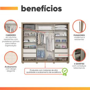 O Guarda Roupa Casal com Espelho Lírio é a escolha perfeita para quem busca sofisticação e praticidade em um só móvel. Seu design moderno conta com portas deslizantes que otimizam o espaço do ambiente, além de um elegante espelho central que amplia a sensação de amplitude no quarto. Internamente, oferece excelente organização com cabideiros super resistentes, prateleiras bem distribuídas e 4 gavetas espaçosas com corrediças telescópicas que garantem abertura suave e durabilidade. Os puxadores modernos e funcionais completam o visual sofisticado, unindo estilo e praticidade. Combina resistência, elegância e funcionalidade, ideal para manter suas roupas e acessórios sempre bem organizados.