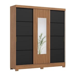Guarda Roupas Casal 3 Portas De Correr Com Espelho Ripado 2 Gavetas Lotus Madeirado / Preto