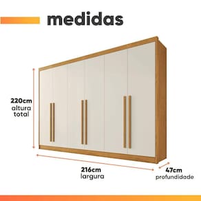 Importante sobre a : A é realizada até a portaria ou porta de entrada do indicado, desde que o acesso seja permitido. Para locais com portaria, a será feita no piso térreo. Não realizamos montagem, desmontagem, por escadas ou içamento. É responsabilidade do cliente verificar se as dimensões do produto são compatíveis com portas, elevadores e corredores. Evite imprevistos: confira todos os detalhes antes de concluir sua compra. MEDIDAS:: A = 237 cm L = 243 cm P = 56 cm | PRATELEIRAS SUPORTAM ATÉ:: 4 kg | GAVETAS SUPORTAM ATÉ:: 4 kg | CABIDEIROS SUPORTAM ATÉ:: 25 kg | PESO:: 218,2 kg | GUARDA ROUPAS SUPORTA ATÉ:: 100 kg | MODELO:: Guarda Roupas Casal 6 Portas 4 Gavetas Chipre | MARCA:: Europa | TIPO DE PINTURA:: UV | MATERIAL DA ESTRUTURA:: MDF | ESPESSURA DO MATERIAL DA ESTRUTURA:: 15 mm | TIPO DE PORTA:: Bater | QUANTIDADE DE PORTAS:: 6 | QUANTIDADE DE GAVETAS:: 4 | CORREDIÇAS:: Telescópicas, abertura suave | QUANTIDADE DE PRATELEIRAS:: 9 | QUANTIDADE DE CABIDEIROS:: 2 | MATERIAL DO CABIDEIRO:: Alumínio | MATERIAL DO PUXADOR:: Madeira, moldura | PÉS:: 10 sapatas plásticas | DIFERENCIAL:: Corrediças telescópicas de abertura suave. | ITENS INCLUSOS:: 1 Guarda Roupa, 1 Manual de montagem, 1 Kit Parafusos. | SISTEMA DE MONTAGEM:: Parafuso, minifix e cavilha | INSTRUÇÕES E CUIDADOS:: Para limpeza de seu móvel, use uma flanela limpa e seca. Não utilize produtos químicos que possam danificar o produto. | GARANTIA:: 3 Meses | AVISO:: Importante sobre a : A é realizada até a portaria ou porta de entrada do indicado, desde que o acesso seja permitido. Para locais com portaria, a será feita no piso térreo. | Altura: 237 cm | Inclui manual de montagem: Sim | Largura: 243 cm | Profundidade: 56 cm | Requer montagem: Sim | Altura da embalagem: 77 cm | Comprimento da embalagem: 226 cm | Largura da embalagem: 160 cm | Peso da embalagem: 23080 g | Tipo da embalagem: sem embalagem adicional | Cor: Madeirado/Off White