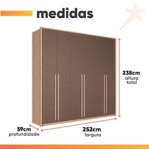 Importante sobre a entrega: A entrega é realizada até a portaria ou porta de entrada do endereço indicado, desde que o acesso seja permitido. Para locais com portaria, a entrega será feita no piso térreo. Não realizamos montagem, desmontagem, transporte por escadas ou içamento. É responsabilidade do cliente verificar se as dimensões do produto são compatíveis com portas, elevadores e corredores. Evite imprevistos: confira todos os detalhes antes de concluir sua compra. MEDIDAS:: [ A ] = 238 cm [ L ] = 252 cm [ P ] = 59 cm | PESO:: 206,25 kg | PESO SUPORTADO:: 115 kg | GAVETAS SUPORTAM ATÉ:: 3 Kg | PRATELEIRAS SUPORTAM ATÉ:: 8 Kg | CABIDEIRO SUPORTA ATÉ:: 5 Kg | MODELO:: Guarda Roupas Casal 6 Portas 4 Gavetas Milano | MARCA:: Santos Andirá | PINTURA DO GUARDA ROUPAS:: Wood com acabamento em verniz fosco | ACABAMENTO DAS PORTAS:: Texturizado com efeito que imita couro | MATERIAL:: MDP (12/15/25mm) | PORTAS:: 6 | TIPO DE PORTA:: Bater (Dobradiças Snow Motion) | GAVETAS:: 4 | PRATELEIRAS:: 7 | QUANTIDADE DE CABIDEIRO:: 3 | CABIDEIROS:: Alumínio | CORREDIÇAS:: Telescópicas Metálicas | PUXADOR:: MDF | DIFERENCIAL:: Portas com acabamento texturizado imitando o couro, puxadores em MDF revestido, gavetas internas com corrediças telescópicas, cabideiros oblongos de alumínio, dobradiças com amortecedores. | SISTEMA DE MONTAGEM:: Parafusos, Cavilha, Minifix. | INSTRUÇÕES E CUIDADOS:: Utilizar panos secos ou levemente úmidos, não utilizar produtos químicos. | GARANTIA:: 3 meses pelo fabricante. | AVISO:: Importante sobre a entrega: A entrega é realizada até a portaria ou porta de entrada do endereço indicado, desde que o acesso seja permitido. Para locais com portaria, a entrega será feita no piso térreo. | Altura: 238 | Inclui manual de montagem: Sim | Largura: 252 | Materiais da estrutura: MDP | Profundidade: 59 | Requer montagem: Sim | Cor: Madeirado/Terracota