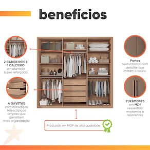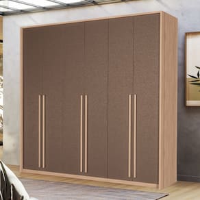 O guarda roupas Milano é bastante funcional para o seu espaço. O charme do modelo Milano são suas portas com acabamento texturizado que imita o couro e dobradiças com amortecedores que garantem design sofisticado ao seu produto, destaca pela beleza e durabilidade. Os puxadores em MDF revestido proporcionam um visual clean e contemporâneo. Conta com 6 portas e 4 gavetas internas com corrediças telescópicas que garantem um deslizamento suave e sem esforço, ideal para armazenar roupas ou acessórios de forma organizada. Os cabideiros, amplas prateleiras e maleiros complementam organização, permitindo que você aproveite ao máximo o espaço interno para itens de uso diário ou peças de roupas. Este modelo é a escolha ideal para quem busca um móvel espaçoso, moderno e funcional.