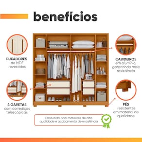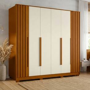 Modernidade e praticidade em um só móvel. Com design moderno e elegante, o guarda roupas Dallas transforma qualquer ambiente, oferecendo amplo espaço para melhor organização de suas roupas e acessórios. Além de toda a funcionalidade, o grande destaque fica por conta do ripado nas portas laterais, que agrega sofisticação e personalidade ao móvel. O detalhe traz textura e profundidade ao design, criando um efeito visual contemporâneo que valoriza a decoração do quarto e torna o ambiente ainda mais aconchegante e elegante. Os cabideiros permitem pendurar roupas longas com facilidade, enquanto as prateleiras internas são ideais para guardar acessórios, sapatos e peças dobradas. As gavetas com corrediças telescópicas garantem abertura suave e durabilidade, e a pintura UV de alta qualidade proporciona acabamento impecável e resistente ao uso diário. Além disso, os pés elevados facilitam a limpeza, mantendo seu quarto sempre organizado e impecável. Um móvel pensado para unir estilo, conforto e funcionalidade em cada detalhe.