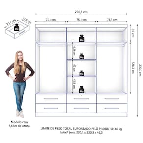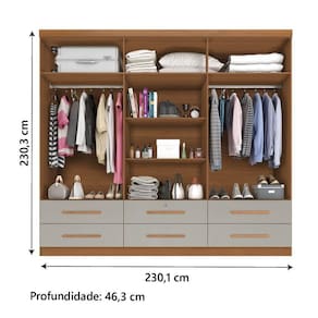 Certifique-se de tudo antes de finalizar a compra, evitando assim futuros desagrados ou imprevistos com a . MEDIDAS:: [ A ] = 230,3 cm [ L ] = 230,1 cm [ P ] = 46,3 cm | PRATELEIRAS SUPORTAM ATÉ:: 05kg | GAVETAS SUPORTAM ATÉ:: 03kg | CABIDEIROS SUPORTAM ATÉ:: 08kg | PESO SUPORTADO:: 40kg | PESO:: 150kg | MODELO:: Guarda Roupas Casal 6 Portas 6 Gavetas Maximus | MARCA:: Zanzini | COR:: Areia/Madeirado | MATERIAL:: MDP 12mm | PINTURA:: Texturizado | ACABAMENTO:: Fosco | PORTAS:: 06 | TIPO DE PORTA:: Bater | GAVETAS:: 06 | PRATELEIRAS:: 02 | CABIDEIROS:: 02 | MATERIAL DOS CABIDEIROS:: Metálico | PÉS:: Não possui | POSSUI SAPATAS:: Sim, sapatas plásticas | CORREDIÇAS:: Metálica | DOBRADIÇAS:: Metálica | PUXADORES:: 12 | MATERIAL PUXADORES:: MDF | ITENS INCLUÍDOS:: 01 Guarda Roupas, 01 manual de montagem e Kit parafusos | GARANTIA:: 03 Meses | AVISO:: A Esplanada Móveis se responsabiliza pela dos produtos adquiridos até a porta de entrada ou portaria do endereço indicado, se a portaria do condomínio permitir, as s são efetuadas no piso térreo e é de responsabilidade do cliente. | ALTURA:: 230,3 cm | LARGURA:: 230,1 cm | PROFUNDIDADE:: 46,3 cm | REQUER MONTAGEM:: Sim Cor: Cinamo/Off
