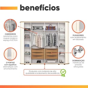 O Guarda Roupa Casal com Espelho Ripado Tango Premium une sofisticação, modernidade e praticidade em um só móvel. Seu design imponente traz laterais arredondadas com acabamento ripado, que adicionam elegância e um toque diferenciado ao ambiente. As portas centrais contam com espelhos, ampliando a sensação de espaço e luminosidade no quarto, enquanto os puxadores longos em dourado reforçam o estilo premium com um detalhe de requinte e sofisticação. Internamente, oferece excelente organização com divisão ELE/ELA, cabideiros resistentes, prateleiras bem distribuídas para roupas dobradas, acessórios e enxoval, além de quatro gavetas amplas com corrediças telescópicas, que garantem abertura suave e durabilidade. Os espaços superiores e inferiores são ideais para malas, sapatos e caixas organizadoras. Com estrutura resistente, acabamento refinado e design marcante, o Tango Premium é a escolha perfeita para casais que buscam aliar funcionalidade, beleza e exclusividade no quarto.