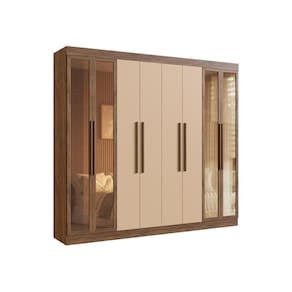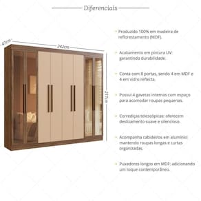 Com 8 portas (sendo as 4 laterais em vidro reflecta) e um amplo espaço interno, tudo fica mais fácil de armazenar. As 4 gavetas internas com corrediças telescópicas garantem sua abertura total e silenciosa, enquanto os nichos espaçosos acomodam roupas dobradas, calçados, travesseiros e cobertores com praticidade. Já o cabideiro metálico foi pensado para otimizar o espaço, permitindo pendurar roupas longas e curtas sem amassar.