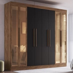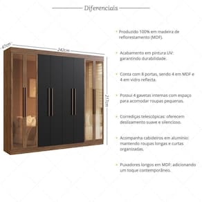 Com 8 portas (sendo as 4 laterais em vidro reflecta) e um amplo espaço interno, tudo fica mais fácil de armazenar. As 4 gavetas internas com corrediças telescópicas garantem sua abertura total e silenciosa, enquanto os nichos espaçosos acomodam roupas dobradas, calçados, travesseiros e cobertores com praticidade. Já o cabideiro metálico foi pensado para otimizar o espaço, permitindo pendurar roupas longas e curtas sem amassar.