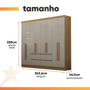 Importante sobre a entrega: A entrega é realizada até a portaria ou porta de entrada do endereço indicado, desde que o acesso seja permitido. Para locais com portaria, a entrega será feita no piso térreo. Não realizamos montagem, desmontagem, transporte por escadas ou içamento. É responsabilidade do cliente verificar se as dimensões do produto são compatíveis com portas, elevadores e corredores. Evite imprevistos: confira todos os detalhes antes de concluir sua compra. MEDIDAS:: A = 220 cm L = 243,6 cm P = 46,5 cm | MEDIDAS DOS PÉS:: A = 5 cm L = 10 cm P = 4 cm | PESO:: 157,6 kg | PESO SUPORTADO:: 102 kg | PRATELEIRAS SUPORTAM ATÉ:: 8 kg | GAVETAS SUPORTAM ATÉ:: 5 kg | CABIDEIROS SUPORTAM ATÉ:: 8 kg | MODELO:: Guarda Roupas Casal 8 Portas 4 Gavetas Turim | MARCA:: Luciane | PINTURA:: UV | ACABAMENTO:: UV | MATERIAL DA ESTRUTURA:: MDP | ESPESSURA DO MATERIAL DA ESTRUTURA:: 15mm | PORTAS:: 8 | TIPO DE PORTA:: Bater | DOBRADIÇAS:: Metálica | GAVETAS:: 4 | CORREDIÇAS:: Metálica | PRATELEIRAS:: 6 | CABIDEIROS:: 2 | MATERIAL DO CABIDEIRO:: Plástico aluminizado | PUXADORES:: 8 | MATERIAL DOS PUXADORES:: MDP revestido | TIPO DE PUXADOS:: Cava | QUANTIDADE DE PÉS:: 8 | MATERIAL DOS PÉS:: Plástico | POSSUI SAPATAS PLÁSTICAS:: Sim | GARANTIA:: 3 Meses | DIFERENCIAL:: 8 portas, 4 gavetas para melhor armazenamento, amplo espaço interno, acabamento UV. | ITENS INCLUSOS:: 1 Guarda Roupa, 1 Manual de montagem, 1 Kit Parafusos. | INSTRUÇÕES E CUIDADOS:: Para maior durabilidade, recomendável que a limpeza dos móveis seja feita com pano limpo e levemente umedecido em água e sabão neutro. Em seguida, deverá ser passado um pano limpo e seco. | AVISO:: Importante sobre a entrega: A entrega é realizada até a portaria ou porta de entrada do endereço indicado, desde que o acesso seja permitido. Para locais com portaria, a entrega será feita no piso térreo. | Altura: 220 | Inclui manual de montagem: sim | Largura: 243,6 | Materiais da estrutura: mdp | Profundidade: 46,5 | Requer montagem: sim | Cor: Madeirado/Mocca