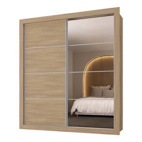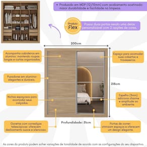 Produzido em MDP (12/15mm) com acabamento acetinado (20% de brilho), este guarda-roupas garante resistência e adiciona um toque de elegância ao seu espaço. Possui 2 portas de correr, sendo 1 delas personalizável, com 1 cor em cada lado, para você escolher a opção que melhor combina com a decoração na hora da montagem. A outra porta, com espelhos de vidro (3mm), amplia o ambiente e oferece uma imagem nítida.