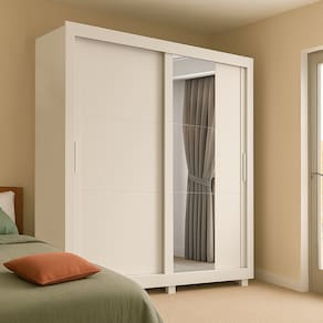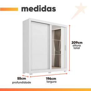 MEDIDAS: [ A ] = 209 cm [ L ] = 196 cm [ P ] = 55,3 cm MEDIDA DOS PÉS: [ A ] = 5 cm [ L ] = 10 cm [ P ] = 5 cm MEDIDAS DE CADA ESPELHO (3 Lâminas): [ A ] = 59,9 cm [ L ] = 36 cm [ P ] = 0,3 cm PESO: 138 kg PESO SUPORTADO: 58 kg GAVETAS SUPORTAM ATÉ: 3 kg PRATELEIRAS SUPORTAM ATÉ: 4 kg CABIDEIRO SUPORTA ATÉ: 5 kg MODELO: Guarda Roupas Casal com Espelho 2 Portas de Correr 4 Gavetas Siena MARCA: Zanzini TIPO DE PINTURA: Semi Fosco ACABAMENTO: UV Verniz MATERIAL: MDP ESPESSURA DO MATERIAL: 12mm PORTAS: 2 (Portas de correr) POSSUI ESPELHO: Sim (3 Lâminas) GAVETAS: 4 PRATELEIRAS: 6 QUANTIDADE DE CABIDEIRO: 2 CABIDEIROS: Metálicos CORREDIÇAS: Telescópicas PUXADOR: MDF QUANTIDADE DE PÉS: 6 MATERIAL DOS PÉS: Plástico GARANTIA: 3 Meses DIFERENCIAL: Porta de correr, corrediça telescópicas proporcionando deslize suave, amplo espelho. SISTEMA DE MONTAGEM: Parafusos auto atarraxantes, cola, cavilhas, pregos