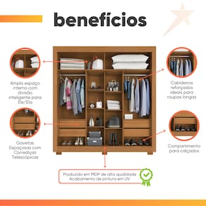 O Guarda Roupa Titanium combina design moderno e funcionalidade, sendo a escolha ideal para quem deseja otimizar e organizar o espaço com elegância. Conta com duas portas de correr que garantem praticidade no dia a dia, além de um excelente aproveitamento interno. Possui seis prateleiras, maleiro espaçoso e quatro gavetas com corrediças telescópicas, proporcionando maior amplitude de abertura e facilidade. Puxadores em MDF, cabideiro metálico e seis pés, ideal para facilitar a limpeza em baixo do guarda roupa.