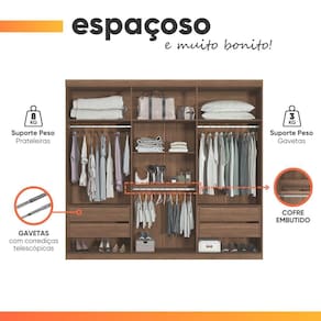 Importante sobre a entrega: A entrega é realizada até a portaria ou porta de entrada do endereço indicado, desde que o acesso seja permitido. Para locais com portaria, a entrega será feita no piso térreo. Não realizamos montagem, desmontagem, transporte por escadas ou içamento. É responsabilidade do cliente verificar se as dimensões do produto são compatíveis com portas, elevadores e corredores. Evite imprevistos: confira todos os detalhes antes de concluir sua compra. MEDIDAS:: A = 219 cm L = 232 cm P = 46 cm | PESO:: 148,95 kg | PESO SUPORTADO:: 94 kg | PRATELEIRAS SUPORTAM ATÉ:: 8 kg | GAVETAS SUPORTAM ATÉ:: 3 kg | CABIDEIROS SUPORTAM ATÉ:: 5 kg | MODELO:: Guarda Roupas Casal Detalhes Frisados Com 6 Portas 4 Gavetas Buriti | MARCA:: Santos Andirá | PINTURA:: Reverse, aplicação de verniz com profundidade, facilita a limpeza do móvel e corrige imperfeições | ACABAMENTO:: Semi Fosco | MATERIAL DA ESTRUTURA:: MDP/MDF (12/15/25mm) | PORTAS:: 6 | TIPO DE PORTA:: Bater | DOBRADIÇAS:: Metálicas | GAVETAS:: 4 | CORREDIÇAS:: Telescópicas metálicas | PRATELEIRAS:: 7 | CABIDEIROS:: 3 | MATERIAL DO CABIDEIRO:: Alumínio | PUXADORES:: Sim, 6 puxadores | MATERIAL DOS PUXADORES:: ABS e MDF | SISTEMA DE MONTAGEM:: Parafusos, Cavilha, Minifix. | DIFERENCIAL:: Gavetas com corrediças telescópicas, cofre embutido, cabideiros em alumínio, puxadores pontuais em ABS, puxadores em MDF revestido e portas em MDF com detalhe usinado ripado. | INSTRUÇÕES E CUIDADOS:: Pano limpo e levemente umedecido em água. Não usar produtos álcool ou produtos químicos. | GARANTIA:: 3 Meses. | AVISO:: Importante sobre a entrega: A entrega é realizada até a portaria ou porta de entrada do endereço indicado, desde que o acesso seja permitido. Para locais com portaria, a entrega será feita no piso térreo. | Altura: 219 | Inclui manual de montagem: Sim | Largura: 232 | Materiais da estrutura: MDP | Profundidade: 46 | Requer montagem: Sim | Cor: Madeirado/Grafite