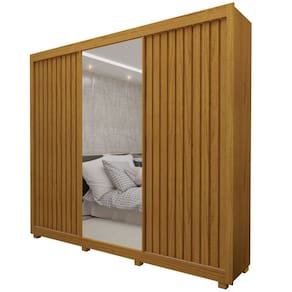 Descrição: O Guarda Roupas Royale se destaca pela praticidade das três portas de correr, sendo 02 portas ripadas (com ripas de verdade) que contribuem para otimização de espaço, contando com um amplo espaço interno, onde sua estrutura é formado por quatro gavetas, quatro prateleiras e espaço para vestidos e calças. O Guarda Roupas Royale conta também com porta central de espelho trazendo mais sofisticação ao produto. Agrada pelo pelo seu design arrojado.
