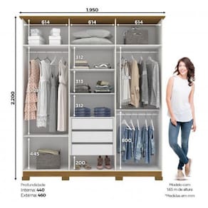 O guarda-roupa Cover é sinônimo de praticidade e versatilidade. Seu espaço interno é otimizado pra acomodar todos os pertences de maneira eficiente. É um roupeiro 6 portas que oferece 03 gavetas com corrediças metálicas, puxadores MDF revestidos, cabideiros e calceiro em alumínio, chapéu com acabamento soft e divisão para roupas longas. Ele atende as mais diversas necessidades e pode ser utilizado como guarda-roupa casal ou armário solteiro.