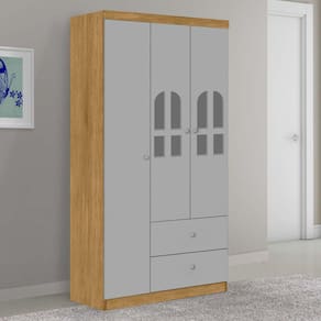 Guarda – Roupa Alvin , 3 portas e 2 gavetas. Qualidade, charme e elegância para o quarto do bebê. Produto misto em MDF/MDP com excelente acabamento com pintura U. V. e Verniz Brilhante de alta resistência que trás durabilidade ao móvel. O roupeiro possui duas gavetas com corrediças metálicas, três portas com dobradiças metálicas e amplo espaço interno com 4 prateleiras e um cabideiro, proporcionando praticidade e organização. O detalhe da porta em acrílico , garante segurança e beleza, refletindo toda delicadeza e aconchego à criança. Acabamento da Gaveta: Pintura UV Acabamento da Porta: Pintura UV Acabamento da Prateleira: Pintura UV Ambiente Principal: Quarto Infantil Complexidade da Montagem: Alta: deve ser montado por um montador especializado Cor: Marrom/Cinza Cor do Produto: Marrom/Cinza Escala de Brilho: Fosco Escala de Brilho da Porta: Fosco Escala de Brilho da Prateleira: Fosco Gaveta com Chave: Não Itens Inclusos: 1 Guarda Roupas, Manual de Montagem e Kit Ferragens Manual de Montagem e Instalação: https://cdn2.madeiramadeira.com.br/atributo/j-a-moveis/1376901-roupeiro-alvin-3-pts.pdf Material da Gaveta: MDP Material da Porta: MDF Material da Prateleira: MDP Material Principal: MDF/MDP Necessita Montagem: Sim Origem do Produto: Nacional Peso: 56.53 Peso Máximo por Gaveta: 8 Possui Cabideiros: 01 Possui Calceiros: Não Possui Espelho: Não Possui Possui Organizador de Gaveta: Não Possui Pés: Não Possui Portas: 03 Possui Prateleiras: 04 Recomendações de Uso, Manutenção e Limpeza: Limpar com pano seco, manter em lugar livre de umidade, ao abrigo de exposição direta ao sol. Sapatas Niveladoras: Sim Sistema de Montagem: Parafusos, tampas, pregos Tipo de Corrediça da Gaveta: Metálica Simples Tipo de Dobradiça/Corrediça da Porta: Metálica Tipo de Gaveta: Externa Tipo de Guarda-Roupa: Infantil Tipo de Puxador da Porta: Externo undefined: 855539