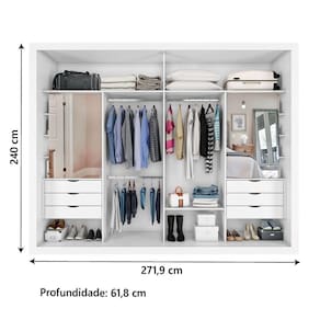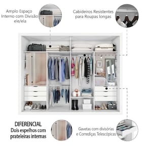 Certifique-se de tudo antes de finalizar a compra, evitando assim futuros desagrados ou imprevistos com a . MEDIDAS:: [ A ] = 240 cm [ L ] = 271,9 cm [ P ] = 61,8 cm | MEDIDAS ESPELHO:: [ A ] = 103 cm [ L ] = 56,6 cm | PESO SUPORTADO:: 81kg | PESO:: 257kg | CABIDEIROS SUPORTAM ATÉ:: 08kg | COR:: Branco | MATERIAL:: MDP 15mm | PINTURA:: Texturizado | ACABAMENTO:: Fosco | GAVETAS SUPORTAM ATÉ:: 03kg | PRATELEIRAS SUPORTAM ATÉ:: 05kg | MODELO:: Guarda Roupas Ripado Casal Com Espelho Interno 2 Portas de Correr 6 Gavetas Coliseu | MARCA:: Zanzini | PORTAS:: 02 | TIPO DE PORTA:: Correr | GAVETAS:: 06 | PRATELEIRAS:: 06 | MATERIAL DOS CABIDEIROS:: Metálico | PÉS:: Não possui | POSSUI SAPATAS:: Sim, sapatas plásticas | CABIDEIROS:: 03 | CORREDIÇAS:: Telescópica | ITENS INCLUÍDOS:: 01 Guarda Roupas, 01 manual de montagem e Kit parafusos | DIFERENCIAL:: Duas gavetas com divisórias organizadoras, dois espelhos internos e detalhe ripado. | GARANTIA:: 03 Meses | AVISO:: A Esplanada Móveis se responsabiliza pela dos produtos adquiridos até a porta de entrada ou portaria do indicado, se a portaria do condomínio permitir, as são efetuadas no piso térreo e é de responsabilidade do cliente. Cor: Branco
