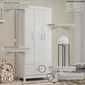 Guarda-roupas Solteiro 3 Portas 1 Gaveta Multimóveis Cr35185 Branco Branco O Guarda-Roupas Solteiro 3 Portas 1 Gaveta Multimóveis CR35185 é a solução perfeita para quem busca praticidade e funcionalidade num móvel. Sua estrutura em MDP garante durabilidade e resistência, enquanto o acabamento em pintura UV confere um toque de sofisticação ao ambiente. Com três portas e uma ampla gaveta externa com corrediças metálicas, esse guarda-roupa se adapta facilmente a ambientes com pouco espaço. Além disso, possui duas prateleiras internas, cabideiro em madeira e pés em PVC que protegem o móvel da umidade e facilitam a limpeza do quarto. Os puxadores em ABS completam o design moderno deste incrível guarda-roupa. Conteúdo da Embalagem: 1 (um) Guarda-Roupa Manual de Montagem Kit Ferragem