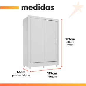 MEDIDAS: [ A ] = 191 cm [ L ] = 119 cm [ P ] = 46 cm ALTURA DOS PÉS: 7 cm PESO: 67,45 kg PESO SUPORTADO: 48 kg GAVETAS SUPORTAM ATÉ: 3 kg CABIDEIROS SUPORTAM ATÉ: 5 kg PRATELEIRAS SUPORTAM ATÉ: 8 kg MODELO: Guarda Roupas Solteiro com 2 Portas de Correr 2 Gavetas Bélgica MARCA: Santos Andirá TIPO DE PINTURA: Verniz brilhante ACABAMENTO: Verniz brilhante MATERIAL: MDP (12 e 15mm) PORTAS: 2 TIPO DE PORTA: Correr POSSUI ESPELHO: Não GAVETAS: 2 PRATELEIRAS: 3 QUANTIDADE DE CABIDEIRO: 2 CABIDEIROS: Alumínio CORREDIÇAS: Metálicas PUXADOR: ABS QUANTIDADE DE PÉS: 6 MATERIAL DOS PÉS: PVC SISTEMA DE MONTAGEM: Parafusos, Cavilha, Minifix DIFERENCIAL: Portas de correr com trilho metálico alumínio puxadores em ABS, pés em PVC, gavetas internas com corrediças metálicas, cabideiros/calceiros em alumínio INTRUÇÕES E CUIDADOS: Usar pano levemente umedecido em água ou seco, não usar produtos químicos. GARANTIA: 3 meses.