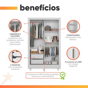 O guarda roupas Bélgica conta tem um design bem moderno, com 2 portas de correr e compartimentos internos que maximizam a organização. Ele conta com cabideiro para roupas, prateleiras, e 2 gavetas para objetos, roupas ou acessórios. O seu acabamento combina facilmente com qualquer decoração trazendo um visual moderno para o ambiente. Com compartimentos bem planejados para organizar roupas, calçados e outros itens de maneira eficiente. Esse design é ótimo para quem deseja otimizar o armazenamento sem abrir mão de elegância.