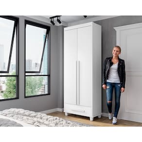 Conta com 2 portas que revelam um espaço interno bem distribuído, com cabideiro para manter roupas sempre alinhadas e prateleiras para organização de peças dobradas, calçados ou caixas. A gaveta inferior oferece armazenamento extra para acessórios ou roupas íntimas, mantendo tudo no lugar e ao alcance das mãos.