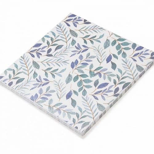 Cor: Predominantemente branco com estampa de folhagens em tons de azul, verde e cinza prateado.