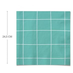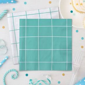 Cor: Tifani (um tom de verde-água ou azul-esverdeado), com um padrão de grade ou xadrez em linhas brancas finas. A imagem mostra dois guardanapos, um com o fundo Tifani e linhas brancas, e outro branco com linhas Tifani, indicando que pode ser dupla face ou apresentar variação no design dependendo da dobra-lado.