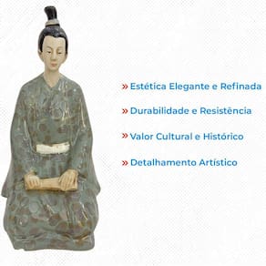Feito de porcelana, o guerreiro é uma obra refinada, com atenção aos mínimos detalhes, Como a textura da roupa e a expressão no rosto, que trazem vida à figura.