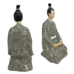 o guerreiro está vestido com uma roupa cinza, que adiciona um toque de sobriedade e elegância à peça, enquanto seus coques no cabelo destacam um estilo tradicional, provavelmente inspirado em culturas antigas ou guerreiros orientais. A postura ajoelhada e o rolo de papel que ele segura sugerem uma atitude de reverência ou comunicação, conferindo à peça um simbolismo de sabedoria ou respeito por algo importante..