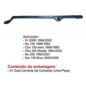 Guia Corrente De Comando Cbx 150 Aero Cbx 200 Nx 150 Nx 200 Características e Benefícios: - Guia Corrente De Comando tem a função de manter a corrente de distribuição alinhada evitando as vibrações do sistema e o desgaste da corrente. Aplicação; - Xr 200R 1994/2002 - Nx 150 1989/1992 - Cbx 150 Aero 1989/1992 - Cbx 200 Strada 1994/2002 - Nx 200 1993/2001 - Nxr 150 Bros 2003/2005 Conteúdo da embalagem: - 01 Guia Corrente De Comando Uma Peça Marca: - THL