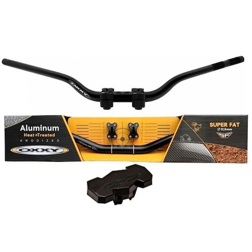 Características do Guidão Oxxy com Adaptador: Fabricado com alumínio 6061-T6 e com 31,75 mm de espessura garante resistência ideal para todas as situações (motrocross ou trilha); Gravação à laser dos ângulos de instalação do guidão; Maior conforto e controle ao pilotar sua moto; Itens inclusos no Guidão Oxxy com Adaptador: Espuma protetora de alta densidade; Adaptador de 31,75 mm em alumínio usinado em maquina CNC 04 Parafusos; Medidas aproximadas do Guidão Oxxy com Adaptador: Largura: 810mm; Diâmetro central: 31,75 mm; Diâmetro nas extremidades: 22,2mm; Altura do modelo Baixo: 85mm; Altura do modelo Alto: 110mm; O Guidão Oxxy Fat Bar é universal, podendo ser instalado em qualquer moto off-road desde que possua um adaptador para tal. Confira as medidas dos guidões OXXY: