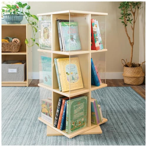 A estante giratória infantil Guidecraft EdQ Kids Rotating Bookshelf é uma torre de livros de chão em madeira de bétula natural, projetada para uso em quartos infantis, salas de aula e brinquedotecas. A base giratória em 360° com três níveis de prateleiras permite que as crianças acessem livros e objetos de todos os lados, facilitando a organização e o uso autônomo.?